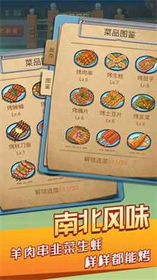 3、店铺经营:达到一定的等级,装修更豪华的桌椅也能增加收益,提升产品的产量,让顾客可以更快的吃到烧烤也是游戏经营的关键所在。此外达到10级后还会相继开通市场,解锁全新的烧烤品类,兑换更多的调味料,为制作出更多美食打下坚实的基础,收集各种人物图鉴,解锁更加美味的烧烤种类, 开始崭新的烧烤撸串人生。