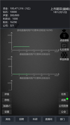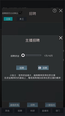 10、主播:需要你签约不同类型的主播,不同的主播职业,性格等很多因素都不一样,所以主播的搭配管理需要你来控制,从而得到最大化的收益。不同的直播间需要你来管理和选择,达到得到最大化的效益。