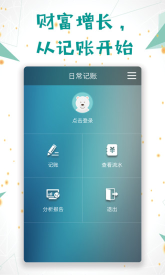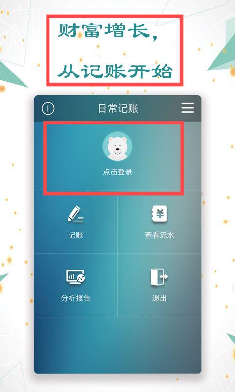 1、这款记账应用界面标注"资产积累从记录开支起步",强调记账对财务规划的关键作用,点击登录即可进入账户管理页面