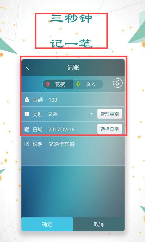 2、记账功能操作界面主打"三秒快速记账",凸显高效记录特性。页面可切换支出与收入分类,示例中录入的100元交通费支出已成功保存
