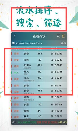 3、收支流水查询界面提供排序检索与条件筛选功能,说明该模块支持对财务记录进行整理与查找