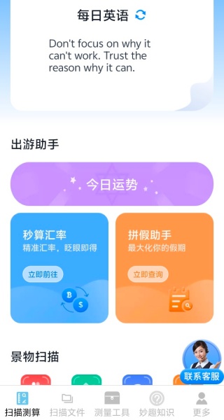 1、扫描测算功能,可进行今日运势查询、汇率速算,还能一键扫描动植物果蔬,即时解答各类测算相关问题。