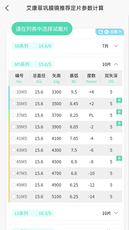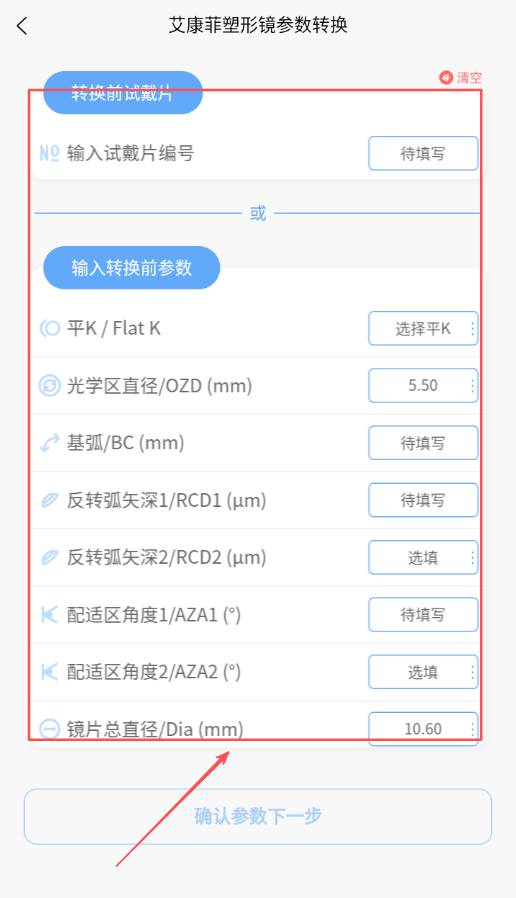 2、进入参数转换页,挑选试戴片编号并录入数据,就能获得精确的单位换算结果。