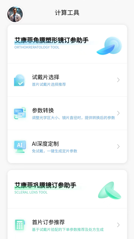 小艾订参app是眼科医生的硬性接触镜专业助手。它可以提供参数转换、AI定制等计算工具,内置完整试戴片数据库与百科知识库,能够帮助医生快速完成巩膜镜、塑形镜等镜片的订参工作。特色的智能推荐系统能自动匹配合适型号,还有分类查找功能让检索更便捷。界面设计清晰直观,有效提升诊疗效率与专业水平,是医生日常工作的得力帮手。