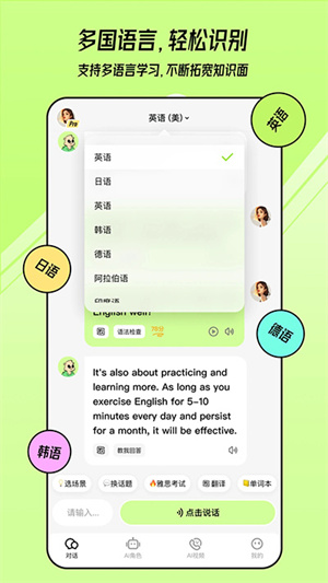 多场景话题选择,雅思陪练、AI视频对话、游戏学习、多语言学习等等
