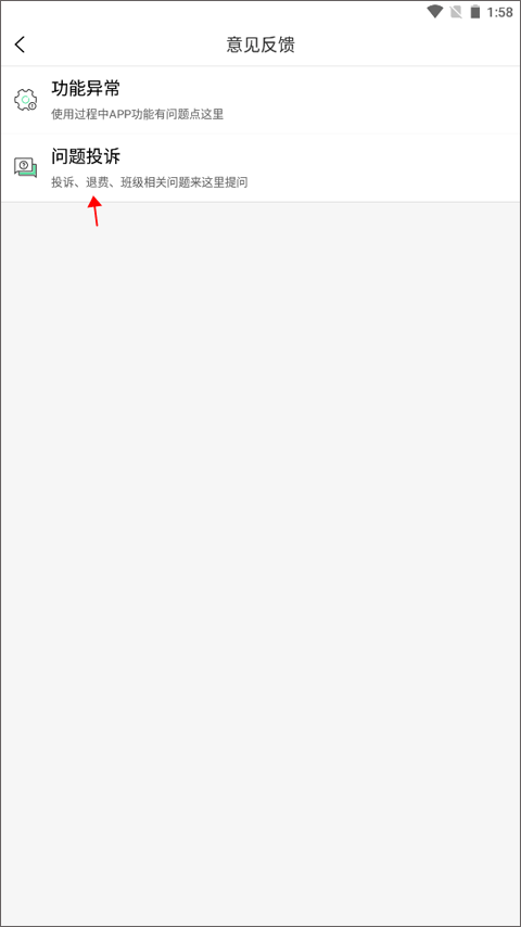 2、反馈类型分为功能异常和问题反映两种。问题反映中包括投诉、退费、班级等问题,点击进入。