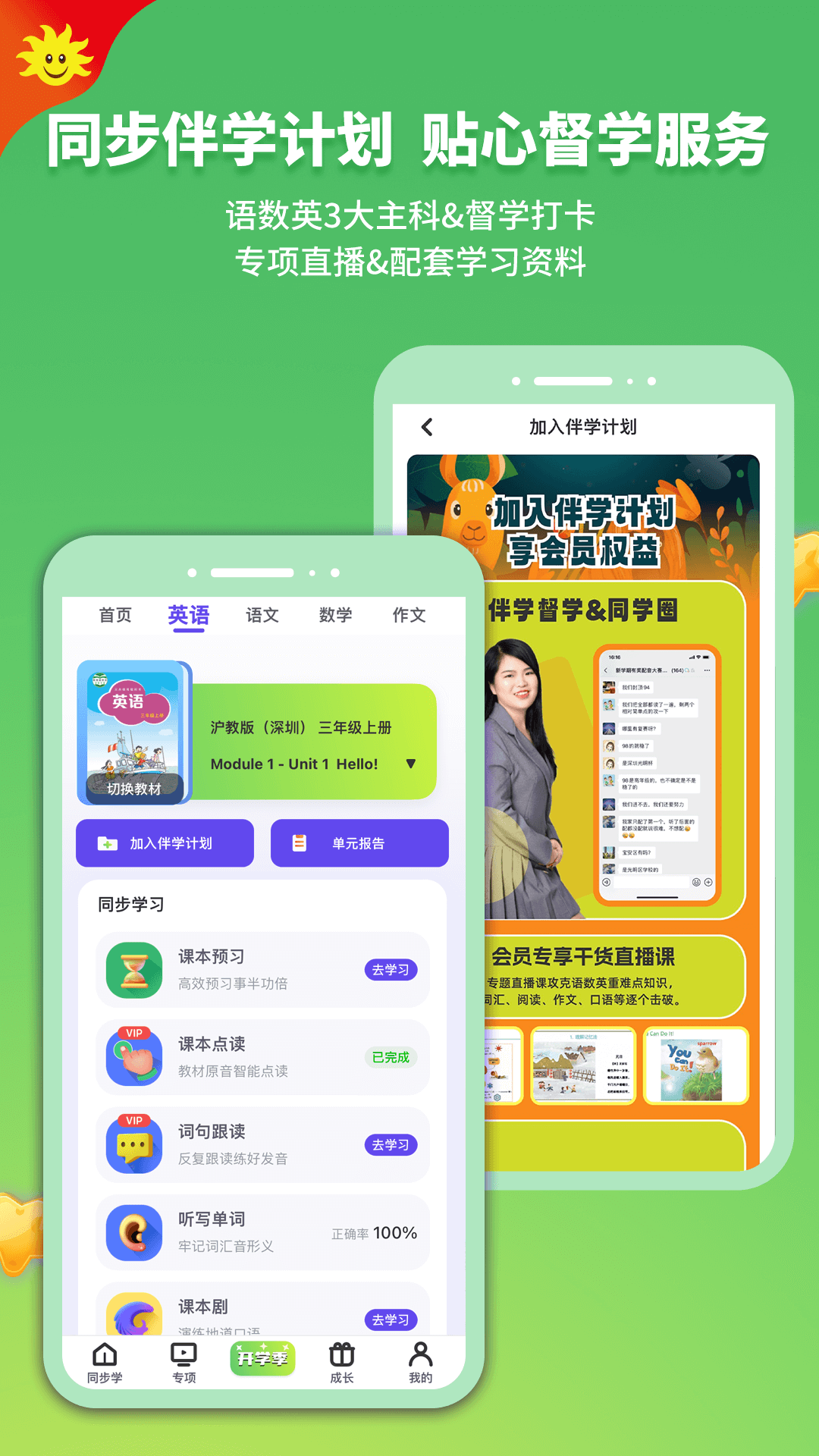 同步学app这款学习应用整合了多科目同步课程,覆盖全国主流教材版本,能够很好的辅导学生进行学习。拥有教材点读、每日训练和趣味配音等功能,能够帮助全面提升学生的听说读写能力。还有在线直播与专属学习资料,支持课后练习与口语训练,帮助学生在轻松氛围中巩固知识,有效提升各学科学业水平。