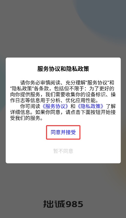 1、打开应用阅读"服务协议和隐私政策"点击"同意并接受"进入程序