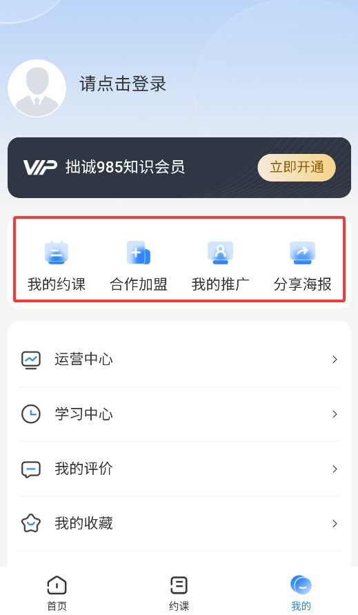 4、个人中心整合我的预约、合作申请及学习进度管理,支持创建分享海报进行推广。