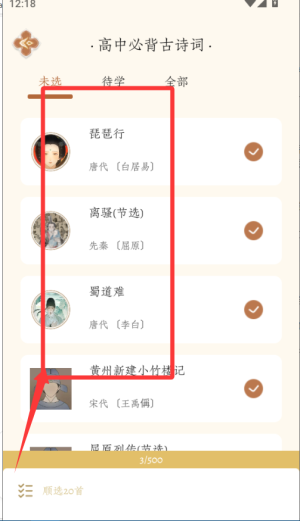 4、分段学习:适配小学、初中、高中语文教材,可在背诵诗文时添加收藏,系统会自动将古典诗词同步到程序内。