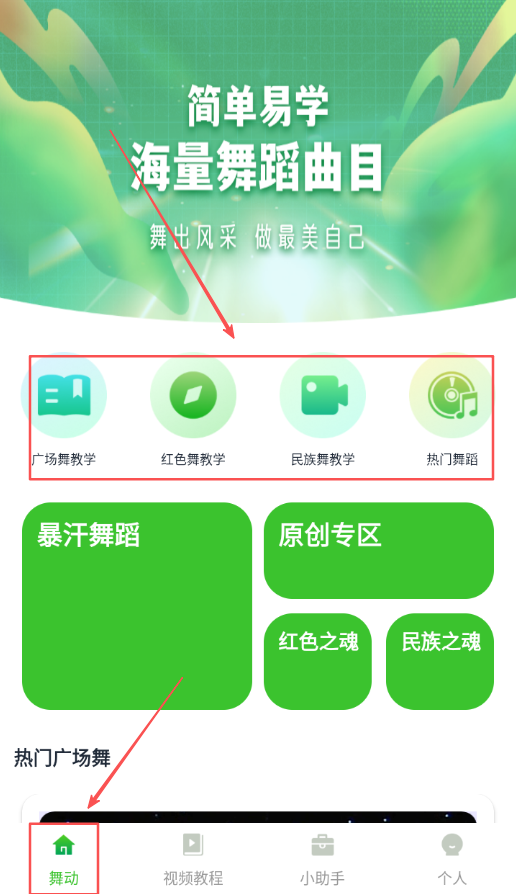 2、内置热门舞蹈专区,及时收集当前流行的舞蹈方便大家跟进学习,紧跟舞蹈时尚动态,不会错过任何流行舞蹈。