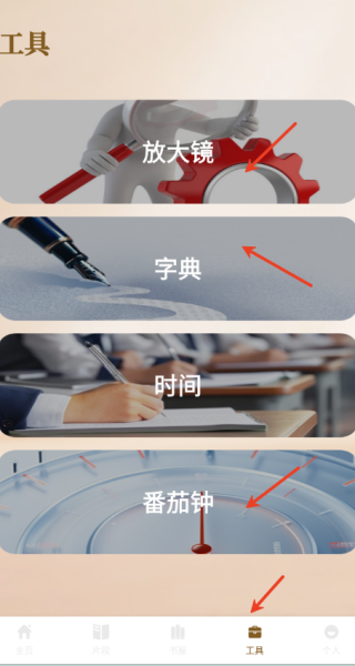 4、在工具栏目之中,大家可以来运用放大镜、字典以及时钟;