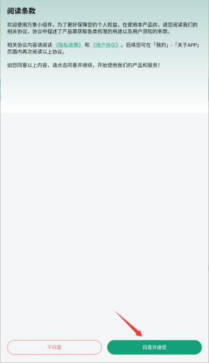 1、首次开启应用时,平台会呈现用户协议与隐私条款,阅读后点按同意按钮进入主界面。