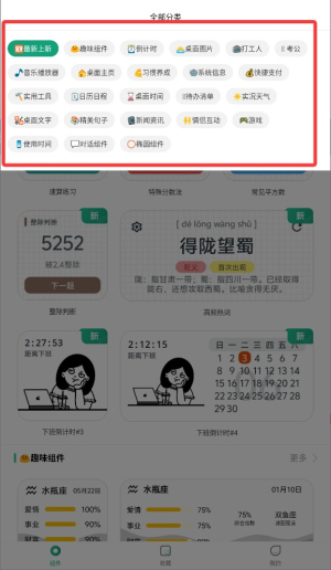 2、在分类目录中挑选需要的组件类型,如时钟、天气等常用工具组件。
