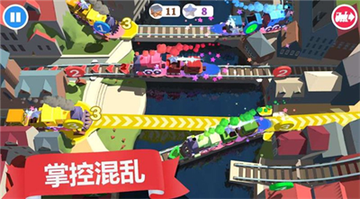 4、挑战难度逐渐升级:游戏中以关卡挑战为主,每一个关卡都有普通、困难、混乱三个等级,前面两个还好,稍微注意一点就能将困难的任务完成,但是后面的混乱难度确实非常大,同时出现的列车太多了,手忙脚乱根本无法正确控制每一辆车的变道,小编玩了很久还是没能顺利完成。游戏关卡难度分等级而设置,为不同的玩家提供了相应的难度挑战,不管是普通玩家还是真正的高手,都能在游戏中找到自己的乐趣。