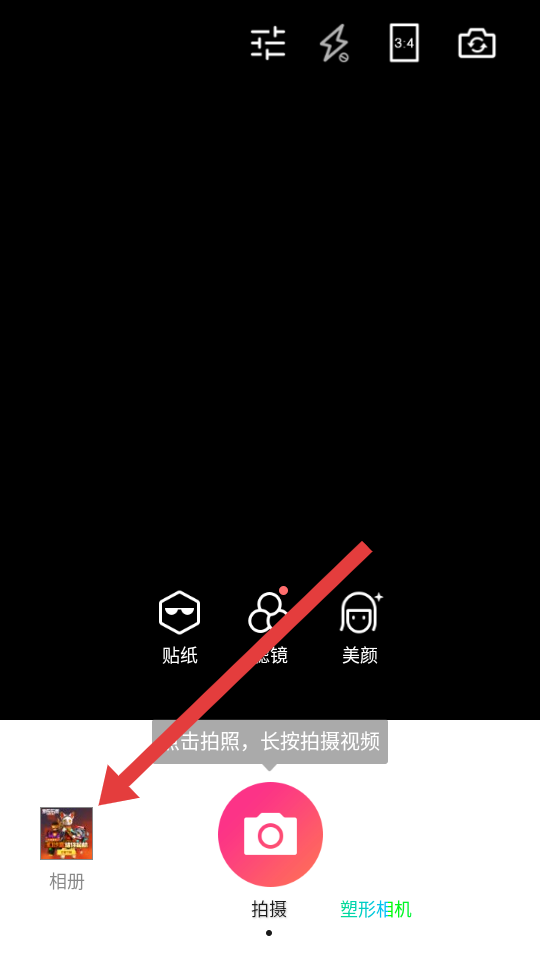 1、在潮自拍拍摄界面左下方,选择相册,进入手机相册选取待编辑照片。