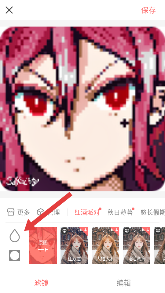 3、在照片编辑页左下方,点击水滴造型的背景虚化按钮,启动背景模糊功能。