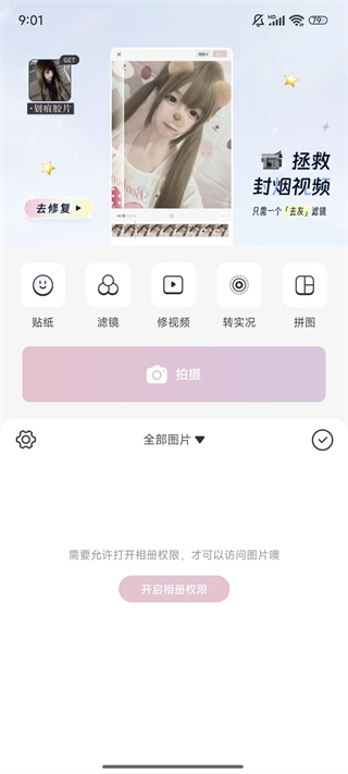 2、首页提供拍照、贴纸、滤镜、视频编辑、实况转换等多种拍摄功能。