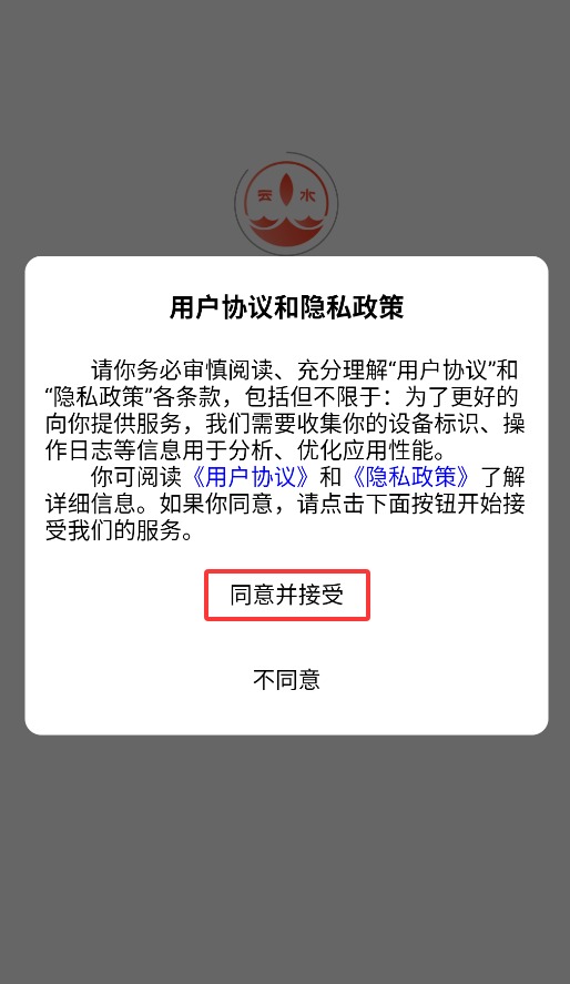 1、首次启动应用时需要确认用户协议提示,方可进入主页面开始使用。