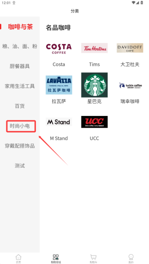 2、在类别里,找到偏好的分类,点击查看相关品牌。