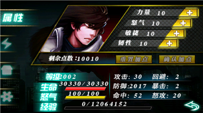 1、合理的分配升级点数。力量关联攻击力,怒气关联技能攻击力,敏捷关联暴击率与命中率,韧性则关联防御力和回避率。如果只加某一种点数可能会提高后期通关难度。
