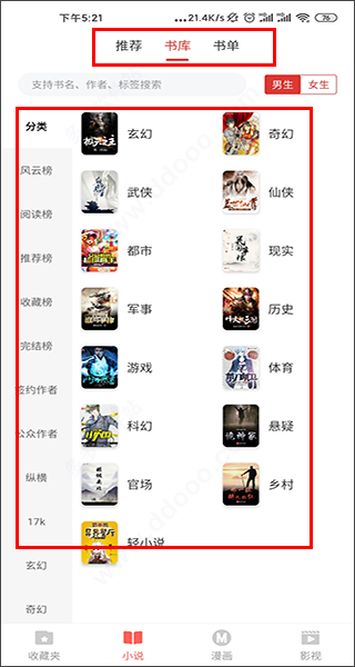 2、在"小说"板块中,主要向读者们准备了推荐、书库、书单三大模块,其中供应了多种题材小说供读者们免费阅览;