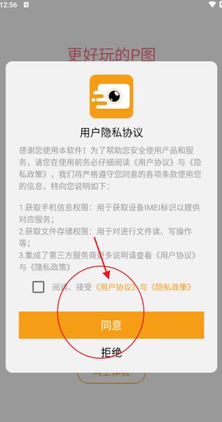 1、安装完毕后,启动趣逗P图工具app,此时会显示用户隐私协议内容,选择同意即可。
