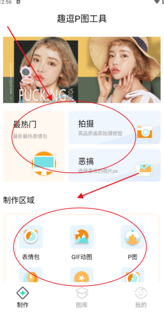 2、点击制作板块,设有热门推荐、拍照编辑、趣味恶搞等服务,一键即可快速开始创作。