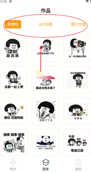 3、选择素材库板块,提供各类表情包、动态图片、图片合集等资源,海量素材随意挑选。